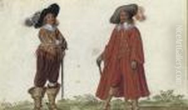 Two Elegantly Dressed Gentlemen Wearing Plumed Hats