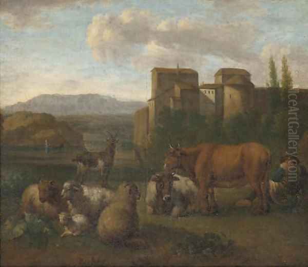 A landscape with a shepherd and his flock near a town