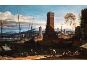 Landschaft Mit Hohen Turmen, Meeresbucht Und Anliegenden Schiffen Sowie Figurenstaffage