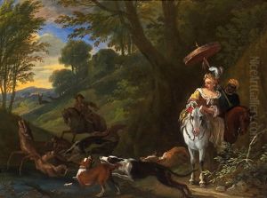 A Wooded Landscape With Huntsmen And Their Hounds On The Banks Of A Lake, An Abundance Of Dead Game In The Foreground