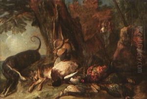A Huntsman Resting By A Sculpted Stone Urn On A Plinth With A Dead Hare Suspended From A Tree And Dead Game On The Ground, And Two Dogs