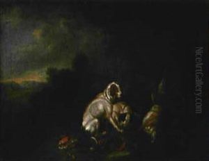 Spaniels Beside A Dead Heron, Finches And Hare In A Landscape (+ A Hound And A Spaniel With Dead Ducks, Finches And Hare In A Landscape With A Huntsman Resting Nearby; Pair)