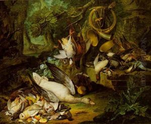 An Italinate Landscape With A Hunt Still Life With Hounds Fighting Over Game...