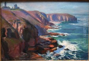 Kustlandschap met een vuurtoren op rotsen gebouwd; in de voorgrond halen vissers een net binnen