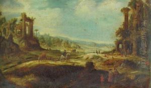 An Extensive Landscape With Travellers By Ruins