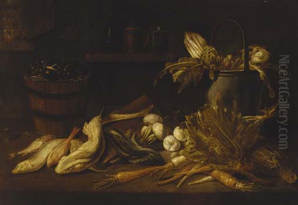 A barrel of mussels, a dogfish and other fish with turnips, carrots, a cabbage and a bucket with artichokes and asparagus on a ledge
