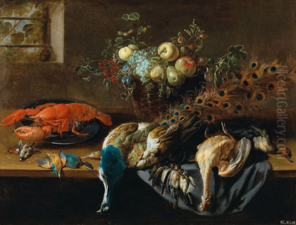 A peacock, fruit, boiled lobster and a prey of birds