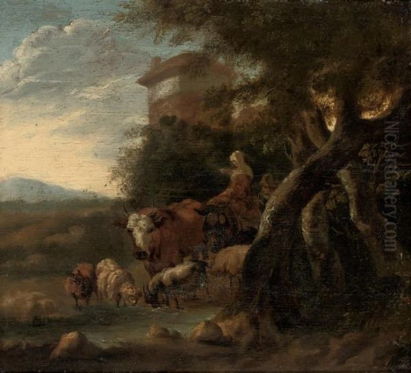 A Wooded Landscape With Cattle Watering And Figures At Rest, A Town Beyond