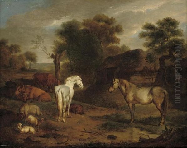 An Extensive Landscape With Horses And Cattle Grazing By Acottage