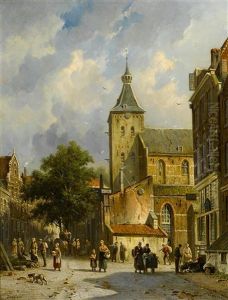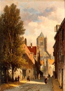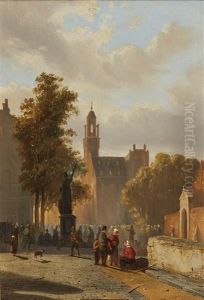 A Sunny Day With Figures In An Amsterdam Street, The Westerkerk Beyond