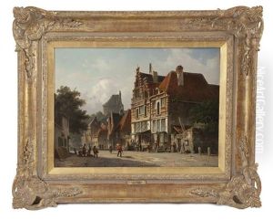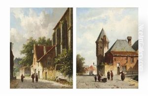 Villagers Strolling In A Sunlit Street (+ Villagers Walking Along A Canal, A Church In The Distance; Pair)