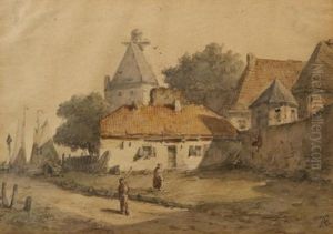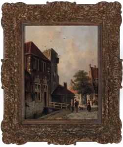 A View In A Town Beside A Canal With Conversing Figures