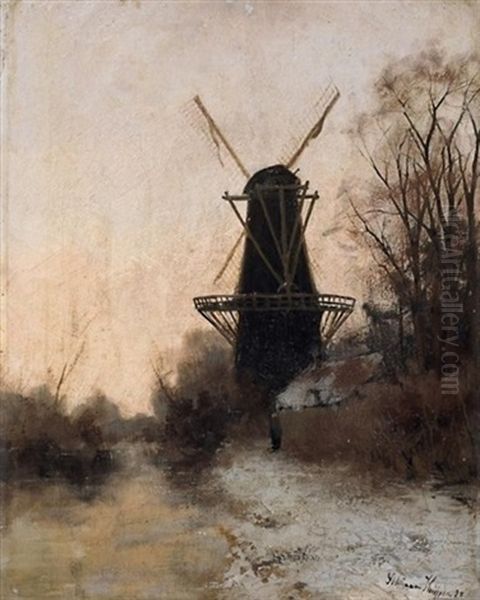 Windmuhle In Verschneiter Fluslandschaft