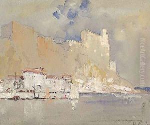 A Harbor With Figures On A Quay And A Hill Town Beyond