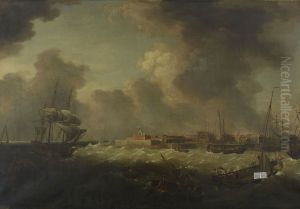 Portrait Of A Gentleman Seated In An Interior, A View Of A Dockyard Beyond