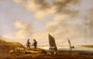 An Extensive River Landscape With A Shepherd And His Dog, Watching His Flock
