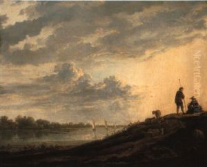 An Extensive River Landscape With Fishermen In A Boat, And Cows And Three Boys Standing On The Land