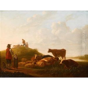 Weite Hollandische Flusslandschaft Mit Ruhenden Kuhen Und Einem Hirten. Sommerliche Abendstimmung