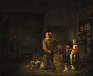 Zwei Kuhe In Einem Stall, Rechts Ein Mann, Der Futter Holt, Links Ein Bauer Mit Korb