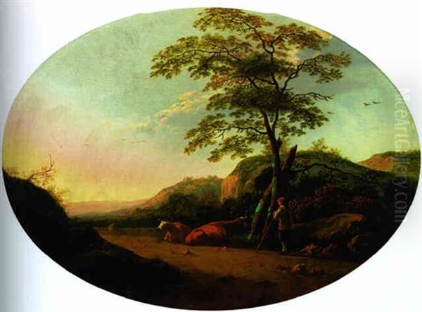 A Landscape At Sunset With Cattle And A Shepherd By A Tree