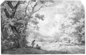 Paysage pres de Rhenen: vaches au paturage et berger jouant de la flute