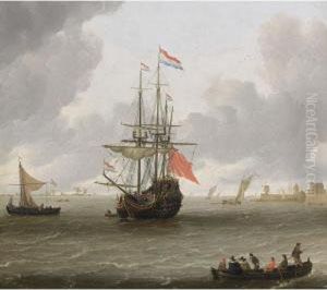 A Merchantman, A Wijdschip, And A Rowing Boat In A Breeze Near A Quay