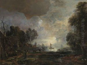 Moonlit River Landscape With Figures And Cattle On The Shore, Boats On The Water And A Town Beyond
