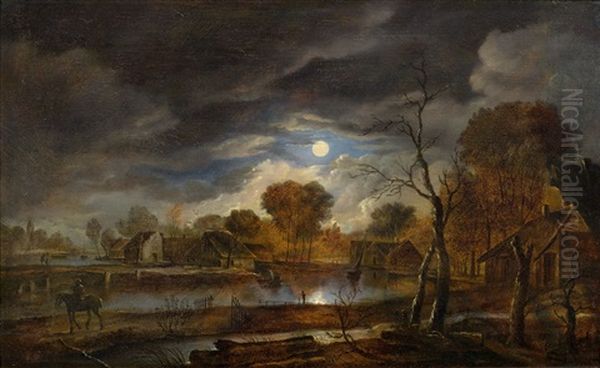 A Moonlit Landscape Oil Painting by Aert van der Neer