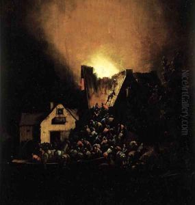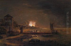A Moonlit River Landscape With A Village Burning In The Background