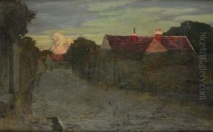 A River Estuary At Dusk With Figures Returning Home Along A Track,a Town Beyond