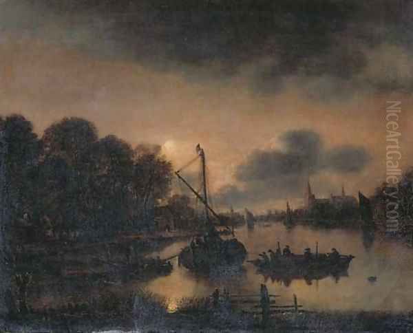 A moonlit landscape with moored vessels on a river, a village with a church beyond