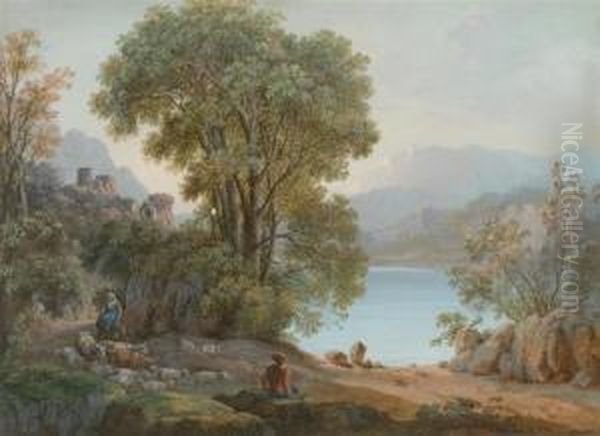 1. Castle Ruin By A Lake With Travellers On A Bridge. 2. Arcadianlandscape With Shepherd And Sheep. A Pair.