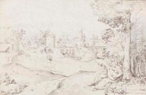 An Extensive Mountainous Landscape With Two Figures In Theforeground And A Castle By A River