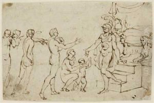 Agostino Tassi, born Agostino Buonamici, was an Italian painter of the late Mannerist and early Baroque periods. He was born in Perugia and is primarily known for his landscape and marine paintings, as well as for being the teacher of the famous baroque artist Claude Lorrain. Tassi's work is characterized by its dramatic use of perspective and emphasis on architectural elements within natural settings. His seascapes often included ships and classical ruins, reflecting the tastes of his patrons who were interested in the grandeur of ancient Rome and the beauty of the natural world.