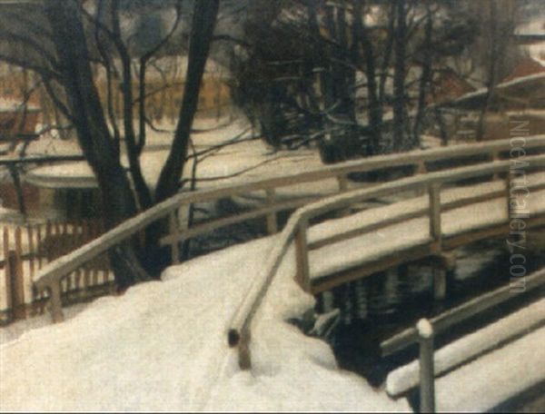 Vintermotiv Med Bro Over + Samt R"da Hus