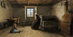 Strickendes Madchen, Kleinkind In Der Wiege Hutend (knitting Girl Watching The Toddler In A Craddle)