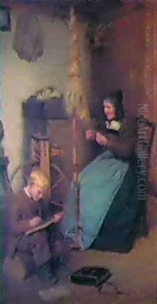 Grossmutter Am Spinnrad Und Schreibender Knabe