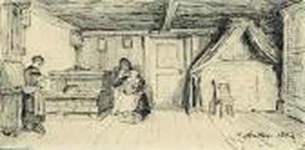Interieur Mit Mutter Und Kind Und Strickender Tochter. 1882.