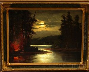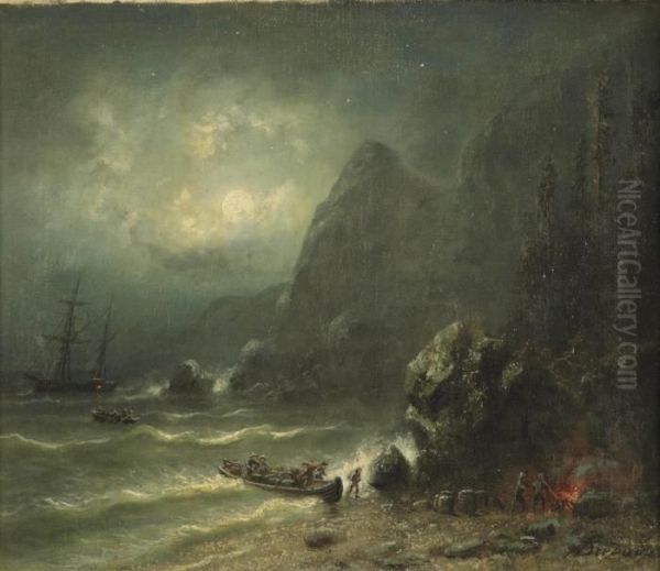 Unloading A Ship On A Seashore By Moonlight