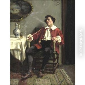 Historisierendes Interieur Mit Pfeife Rauchendem Edelmann