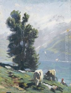 Paysage De Montagne Avec Vaches Et Personnage Au Bord Du Lac