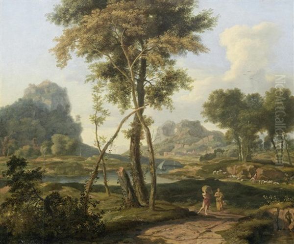 An Arcadian River Landscape With Travellers On A Path