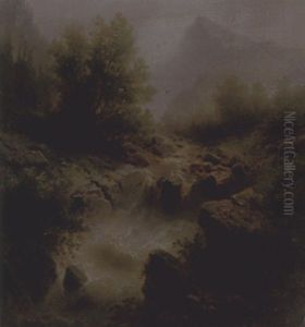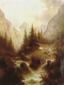 A Moonlit Mountainous Landscape With A Stream Cascading By A Wooded Cabin