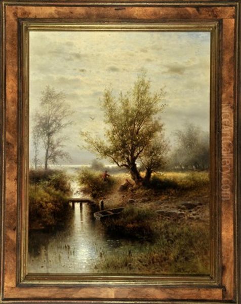 Bachlauf Mit Angler Oil Painting by Albert Rieger