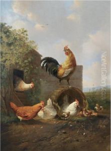 Three Dogs In A Landscape ; A Rooster With Hens And Chicks