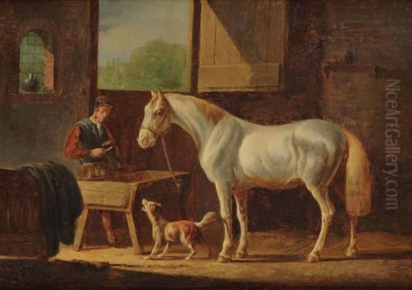 Stable Interior With Horse, Dog And Jockey