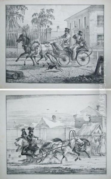 Dorozka I Sanie Dwukonne-para Litografii