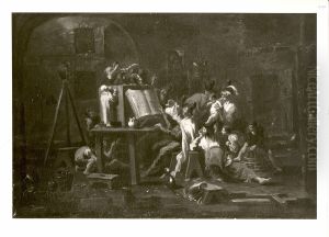 Schaustellergruppe beim Uben mit einem sprechenden Raben.