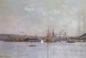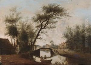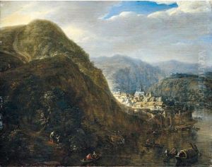"paisaje Con Rio Y Pescadores Con Ciudad Al Fondo"