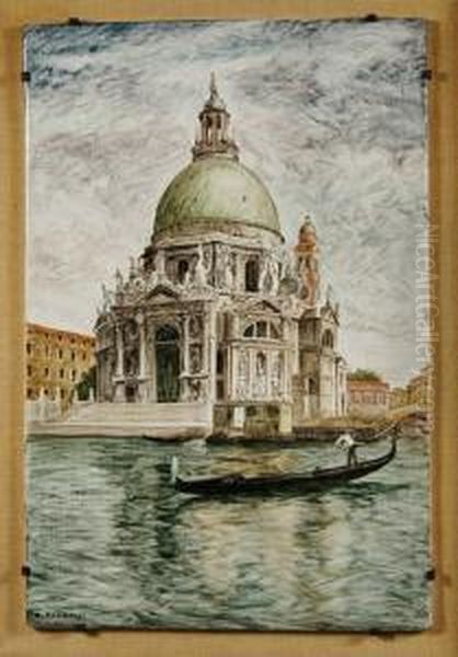 "veduta Della Chiesa Della Salute - Venezia" Piastrella In Ceramica Dipinta In Policromia Firmata In Basso A Sinistra, In Cornice